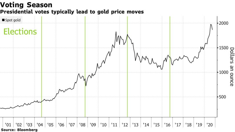Během posledních 20 let mělo zlato sklon pohybovat se jak v předvečer, tak po skončení amerických prezidentských voleb, jak investoři zvažovali možný dopad na dolar, dluhopisové výnosy a globální politické riziko. Listopadové volby budou asi nejnapjatějšími za poslední desítky let a vyvolají nejistotu, kterou si zlato bude určitě užívat.