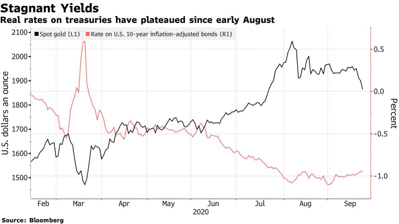 Přitažlivost zlata jako investice během léta vylepšilo, když reálné sazby amerických státních dluhopisů spadly hlouběji do záporu. Od počátku srpna stagnovaly. Dostat je níž bude znamenat velikou vzpruhu pro inflační očekávání.