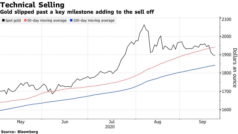Pokles zlata nabral tento týden na tempu, když se jeho cena dostala pod 50denní klouzavý průměr. Obchodníci orientovaní na technickou analýzu to mohou brát jako signál k prodeji. Příštím klíčovým milníkem je 100denní klouzavý průměr, který by měl padajícím cenám poskytnout určitou oporu. Sestup pod tuto úroveň by ale mohl vyvolat další výprodej. Ve čtvrtek se se spotová cena obchodovala na nejnižších hodnotách od 22. července.