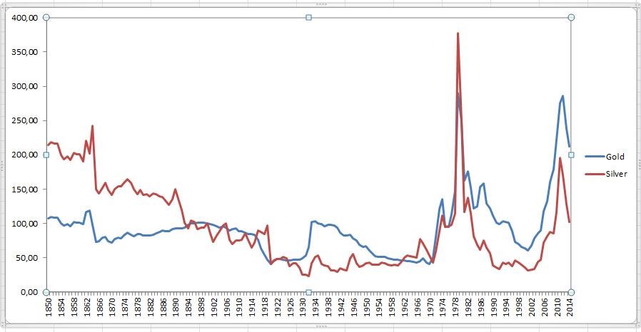 Dlouhodobý vývoj reálných cen zlata a stříbra (1850 – 2014, index se základem v roce 1900)